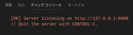 VSCodeのデバッグタブの構成リストにlaunch.jsonのnameに指定した名前が表示されるので、選択して、実行アイコンををクリックするとサーバが起動します。