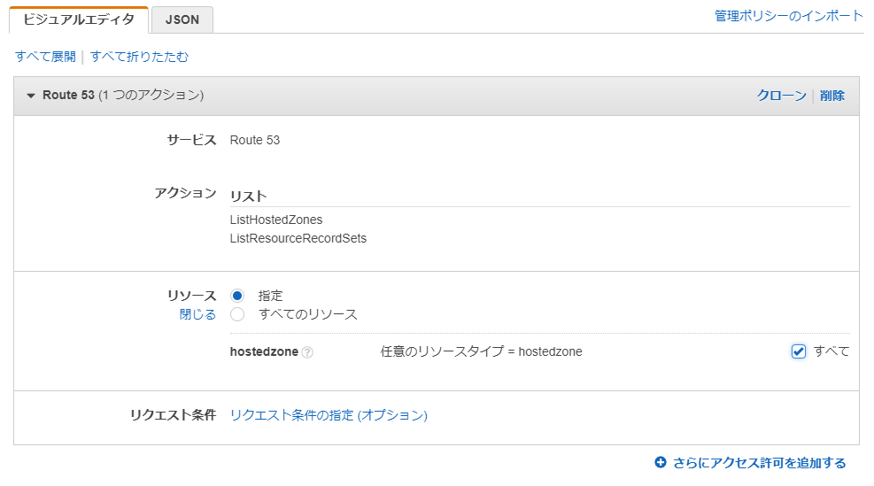 このユーザには、ListHostedZones, ListResourceRecordSets権限が付与されている必要があります。