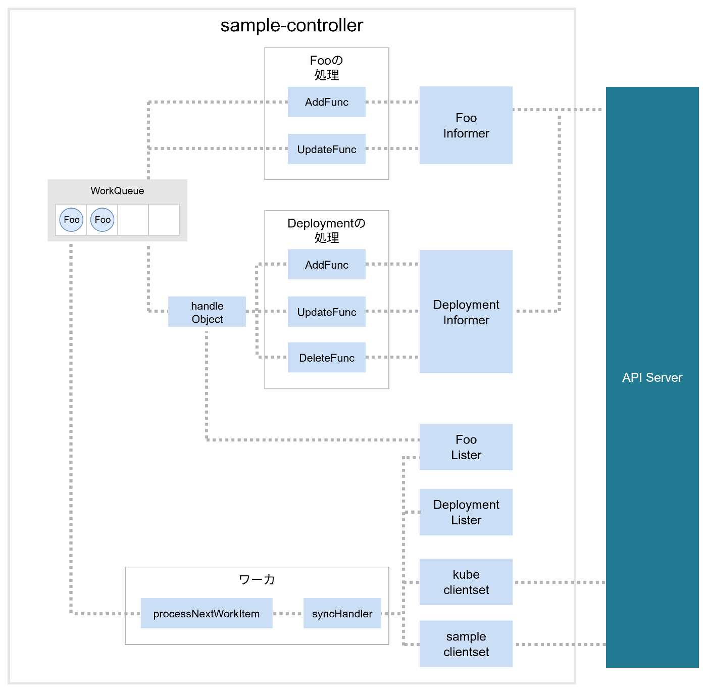 実はsample-controllerのリポジトリにはclient-goとCustom Controllerの各種役割が描かれた概要図があります。その概要図と今回作成した図を見比べてみましょう。