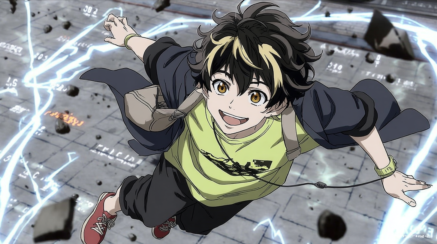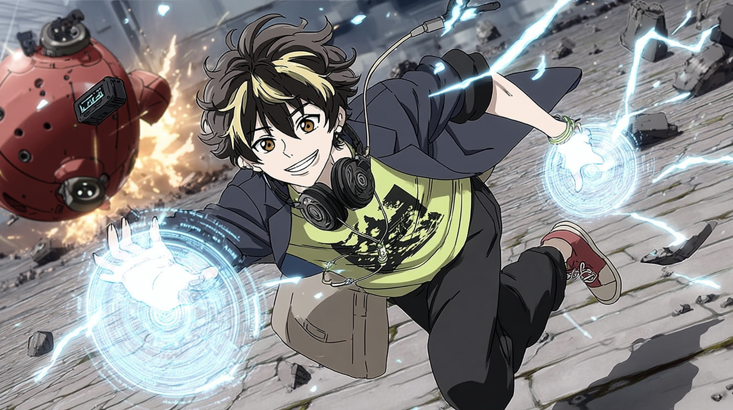 少年が黄色いコートと黒いパンツ姿で空中に浮かび、手から稲妻を放ってロボットを攻撃する。未来都市のデジタルスクリーンが光る背景で、ロボットの頭部が青白いエネルギーコアを爆発させ、金属破片が火花と共に飛散する。カメラは固定され、緊張感ある戦闘の瞬間を捉える。
