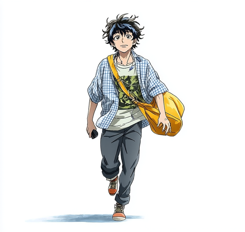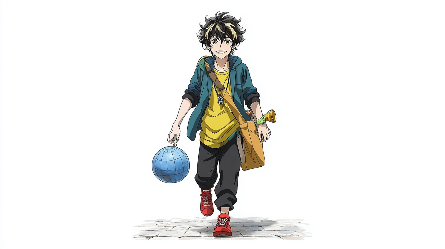 アニメ風の元気な少年キャラクターが歩いているシーン。くしゃっとした黒髪に金色のハイライトが入り、目は金色で明るい笑顔を浮かべている。ライムグリーンのグラフィックTシャツの上にネイビーのジャケットを羽織り、黒いパンツの裾を足首でロールアップしている。赤いハイカットスニーカーを履いて、歩く動作の途中で片足を前に出している。肩には茶色のショルダーバッグ、首には黒いヘッドホンと笛のようなペンダントを下げている。左手には青い地球儀(グリッド線付き)を軽く持っている。背景はシンプルな白または街の通学路でも可。ポーズは自然でリラックスしており、歩きながら前を見て笑っている。現代的でテックに強く、好奇心旺盛な雰囲気を表現。