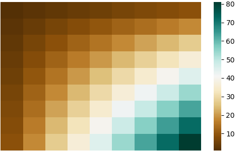 sns.heatmap(df, cmap='BrBG_r')