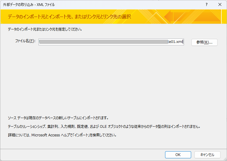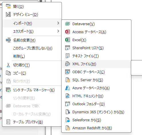 Access では、左側のテーブル名において、マウス右クリックでインポートを選択して、XMLファイルを取り込みます。