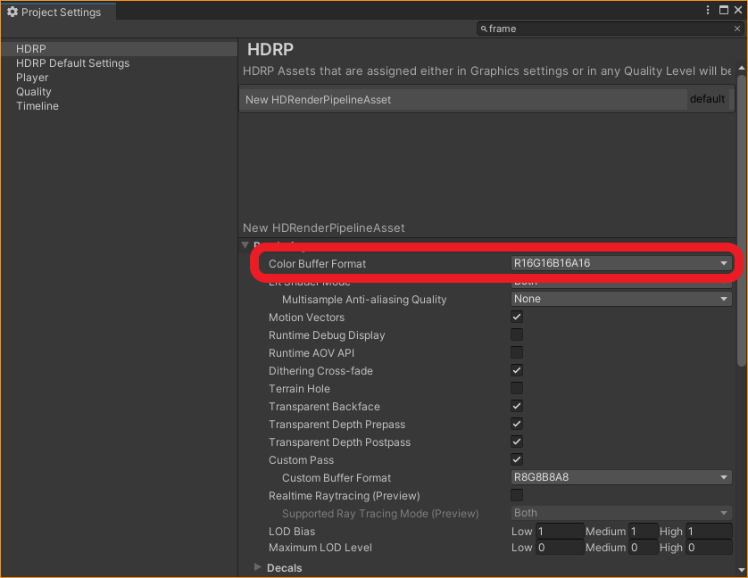 注: High-Definition Render Pipeline (HDRP) やその他の Scriptable Render Pipeline (SRP) ベースのレンダラーを使っている場合、Color Frame Buffer をデフォルトの RGB 10bit から RGB 16bit(8bit があればそちらでも可)に設定する必要があります。