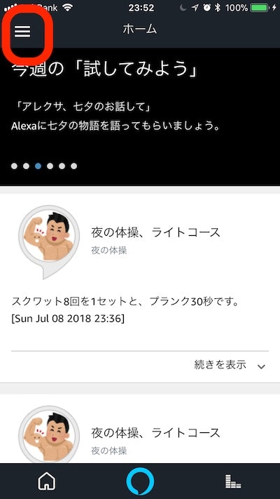 早速ですが、先日Amazonスキルストアの審査が通って公開できた、**「夜の体操」という名前のエロそうでエロくないアレクサスキルをスマホ版アレクサアプリで使っていただく方法**をご案内したいと思います。