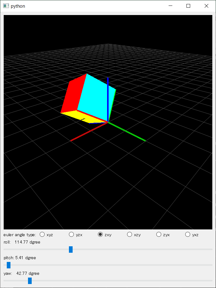 以下にXYZとZXYオイラー角の計算を示す。明らかに最終な回転行列は全く異なる。そのため、オイラー角を使うときには、回転の順番を決めることが非常に重要である。