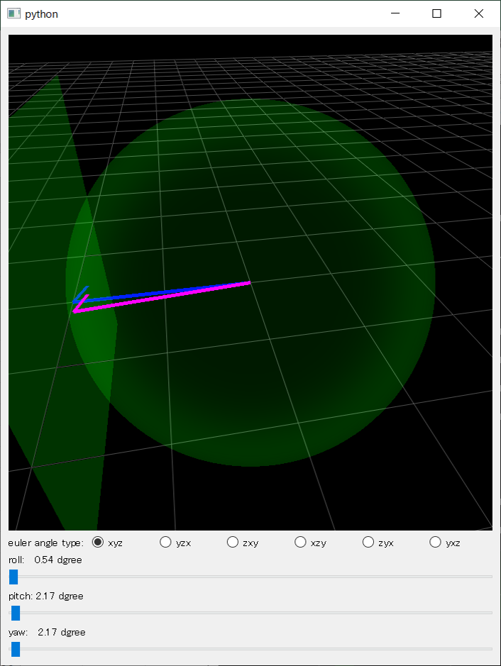 式(6)から、pitch=90°のとき、$R_{xyz}$はZ軸回りの回転となり、回転角度は$\theta$($\theta = \alpha - \gamma$)となる。