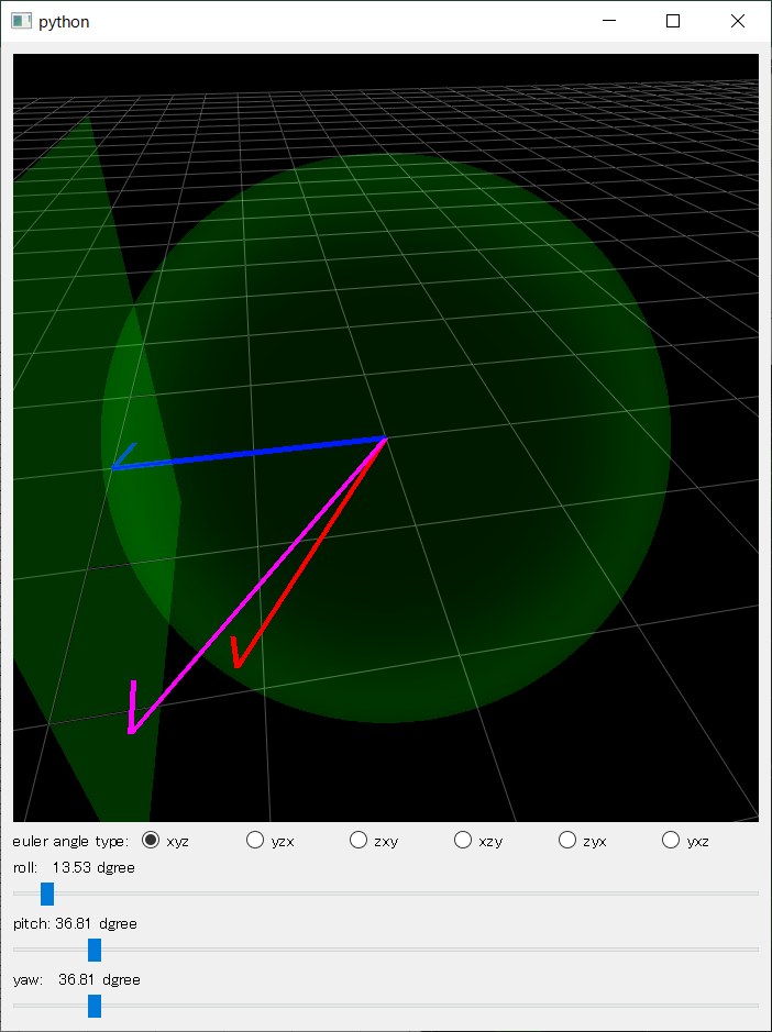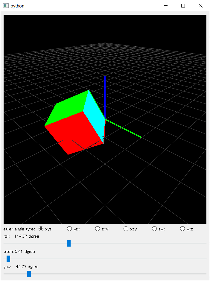 以上、三つの回転行列を掛け算すると、任意の三次元回転が表現できるが、行列の掛け算は可換則を満たさないため、x,y,z回転の順序が変わると、最終的に異なる回転行列が生成される。