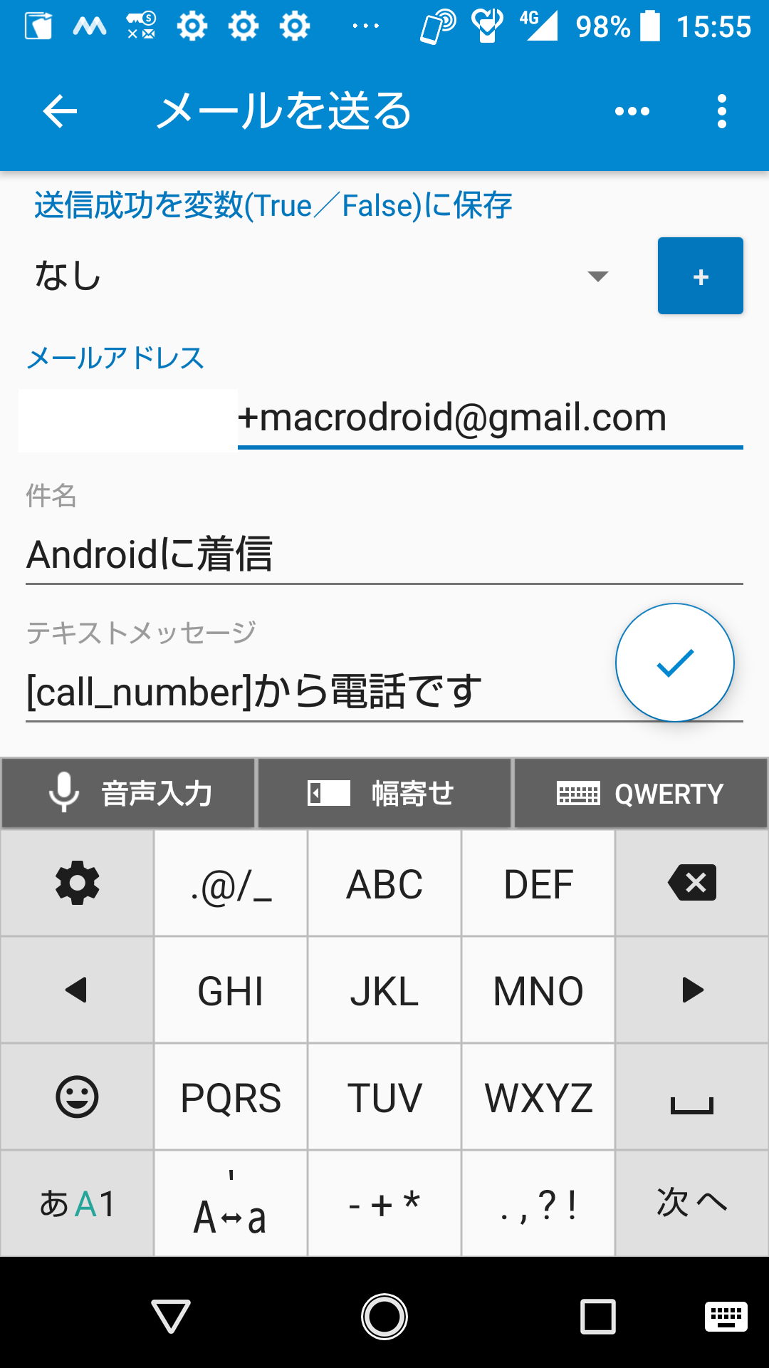 メールのアクションには[call_number]を入れておけば、かかってきた電話番号がメールに入力されます。