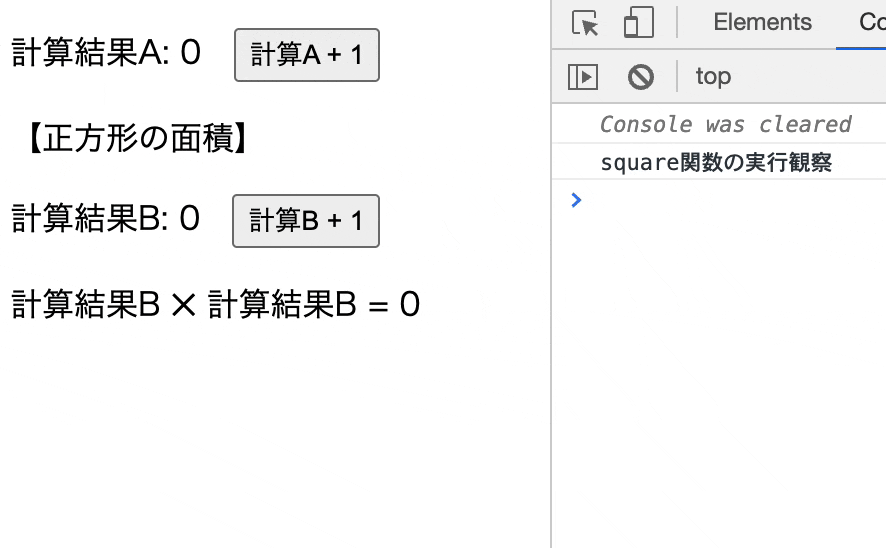 resultA関数が実行されたことによるコンポーネントが再描画されたタイミングでもsquare関数が実行されています。