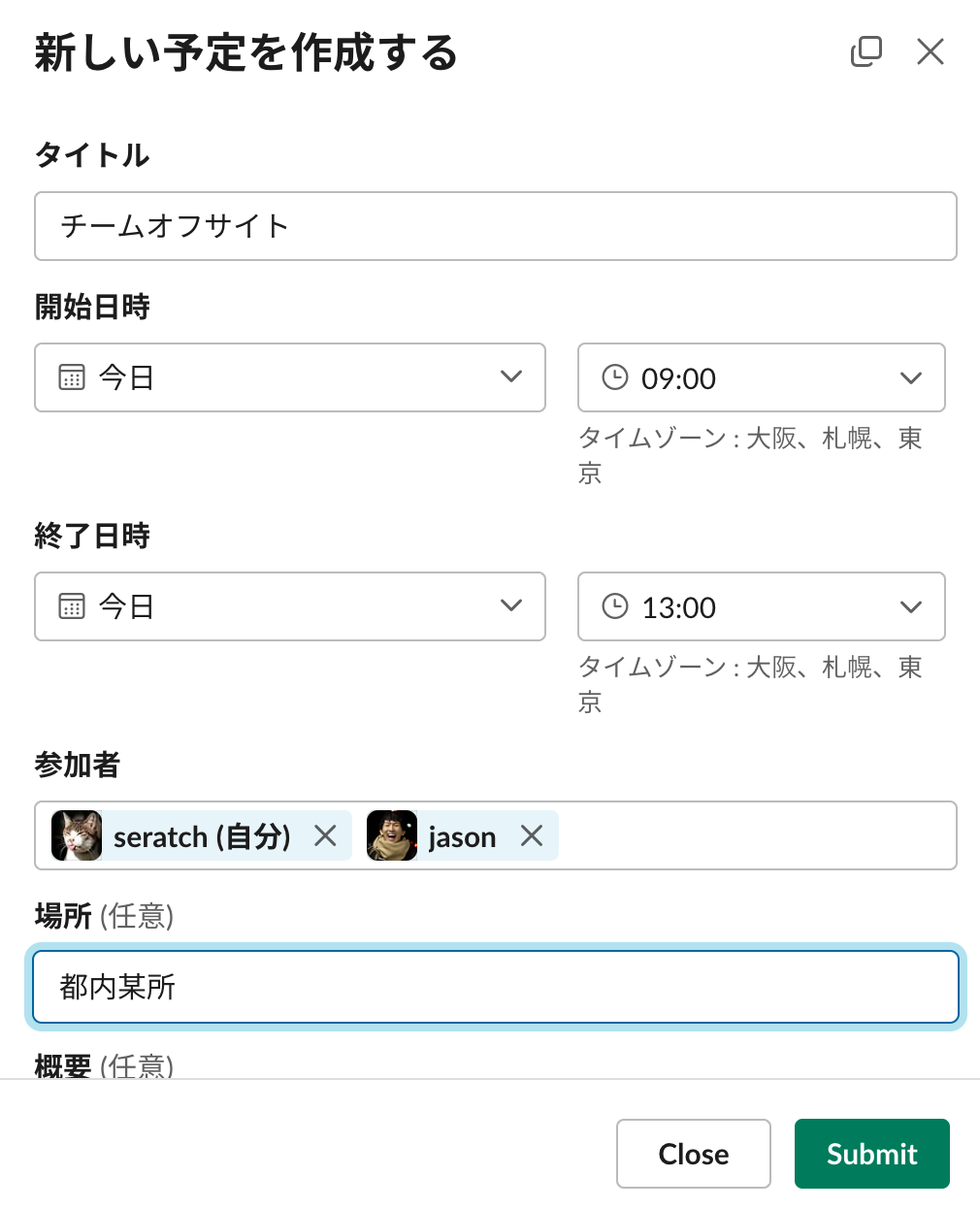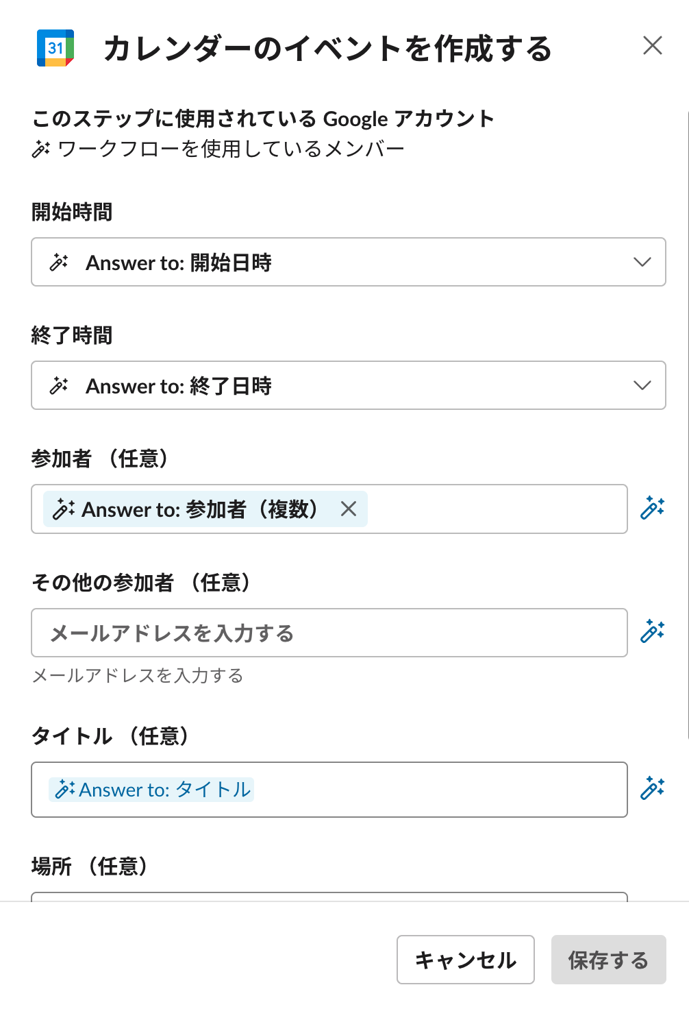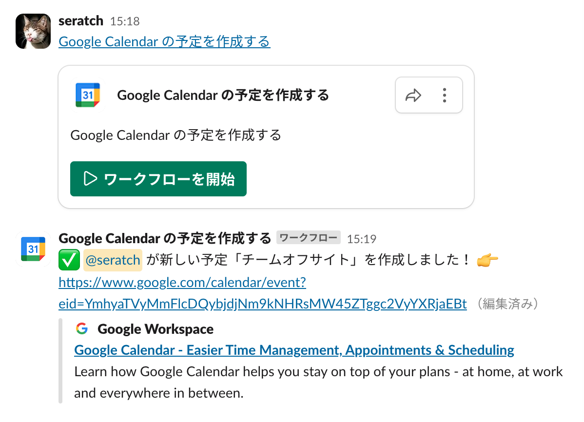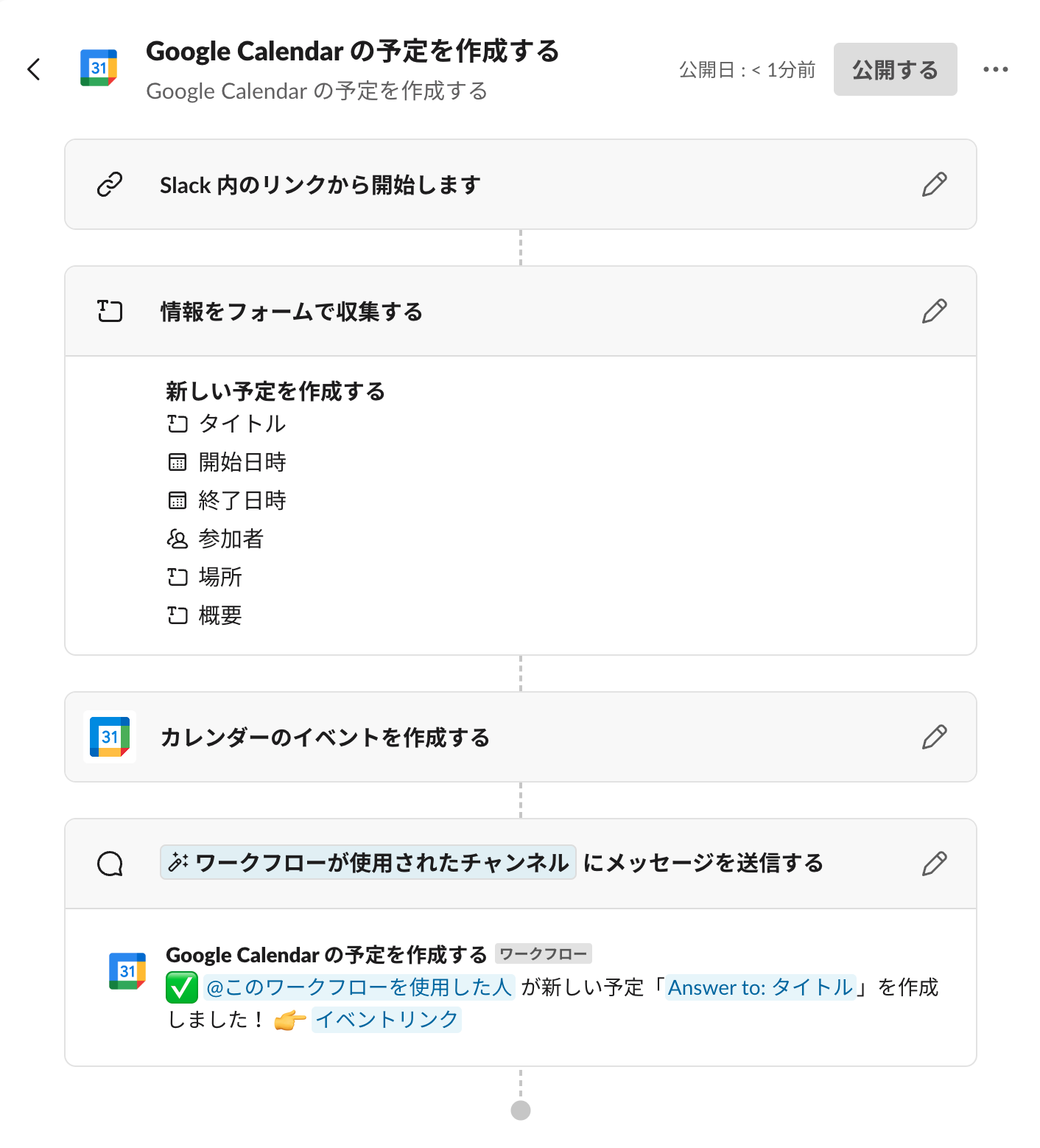Google Calendar の UI 上だと参加者の予定も見られるので、もしもこのまま使うとしたら「普通に Google Calendar を開いてやった方が便利なのでは・・・?」という感じではあります。しかし、他のステップから受けた入力を使って予定を作るといったユースケースであればうまくハマることもあるでしょうし、今後、Slack のワークフロー基盤により便利なステップが追加されたときに組み合わせることもできるでしょう。