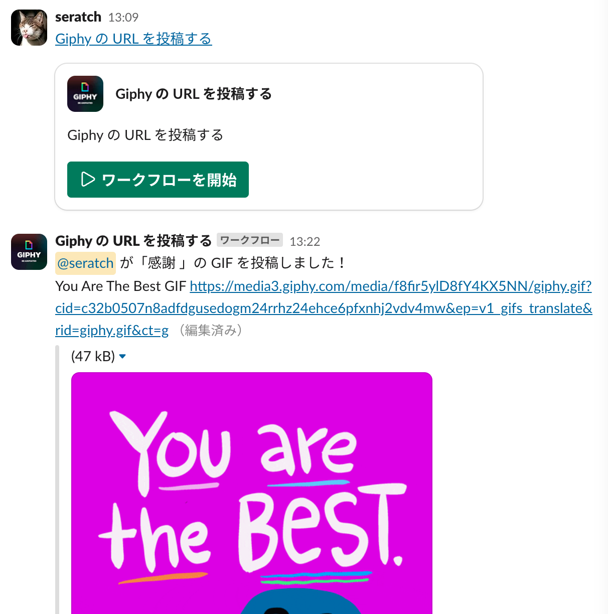 もし該当する GIF がなかった場合、画像なしでメッセージが投稿されてしまうのがあんまりイケてないですが、スタンダードワークフローとして利用する場合はやむをえない制約となります。。