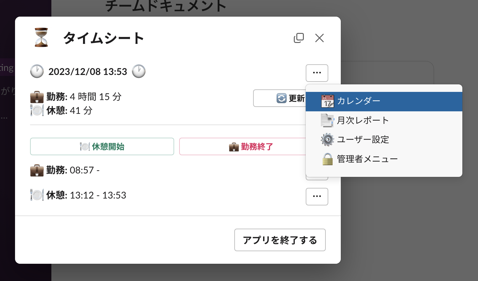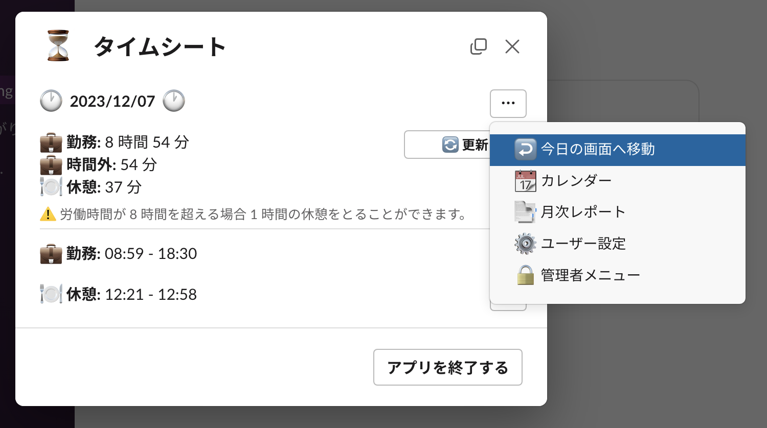 このアプリはこのボタンをクリックして起動することができます。モーダルウィンドウが開くので、そこから先はそれを別ウィンドウにして退勤まで開きっぱなしにしておくとよいでしょう。