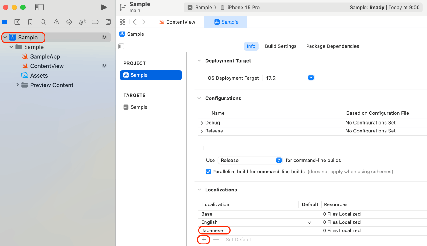対応言語のLocalizationを追加する。Project名を選択し、infoのタブのLocalizationの箇所の「+」をクリックします。言語が選択できるので今回は「Japanese」を選択。
