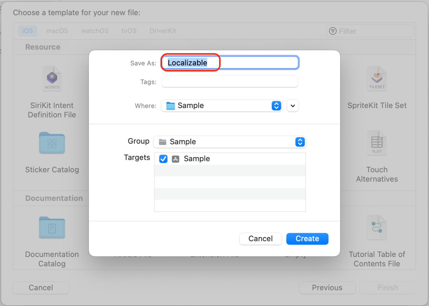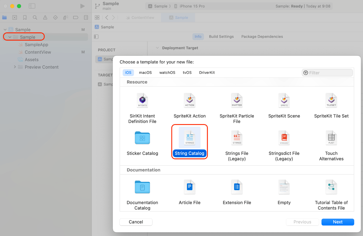 アプリモジュールのGroupで右クリックし、「New File」から「String Catalogs」を選択してファイルを追加。
