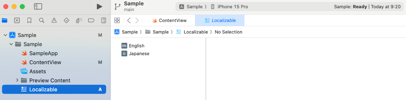 追加したLocalizableファイルでビルド(command + B)を押す。デフォルト言語の文字列リソースをkey-value形式で格納。