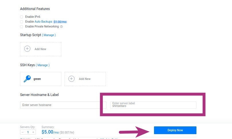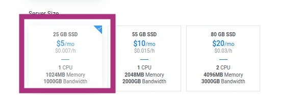 今回は、25GBSSDを選びました。料金は、$5/MO $0.007/h です。これは、インスタンスを作っている間は毎時70セントはかかるよ。だけど、Max月5ドルだよ。という意味です。何もしていなくてもインスタンスをDestroyするまでは課金されます。しかし、どんなに使ってもMax5ドルまでということです。