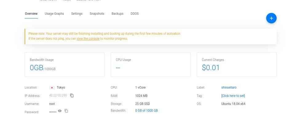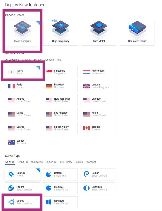 今回は、Cloud Compute / Tokyo (region) / Ubuntu 18.04 x64 を選びました。