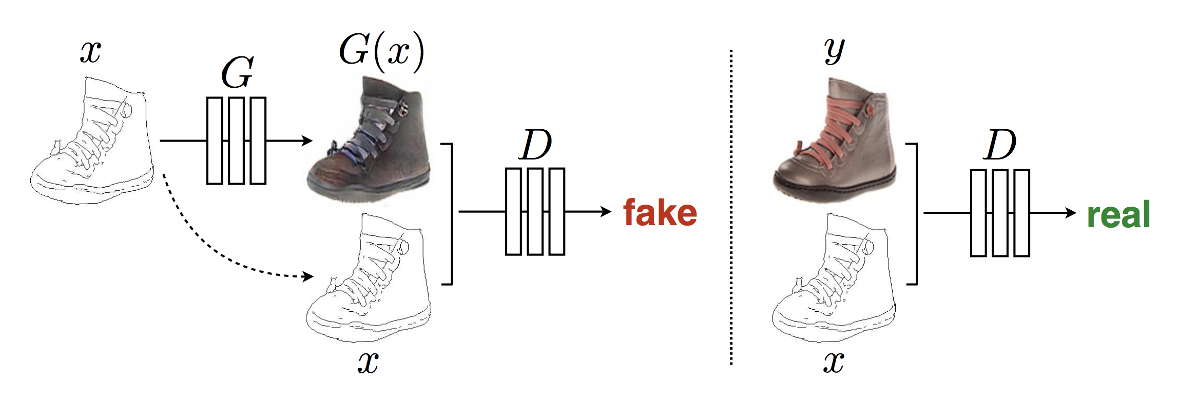 通常のGANとは違い、生成後の画像G(x)だけでなく、入力xもペアとして観察し、True/Falseを判別しています。