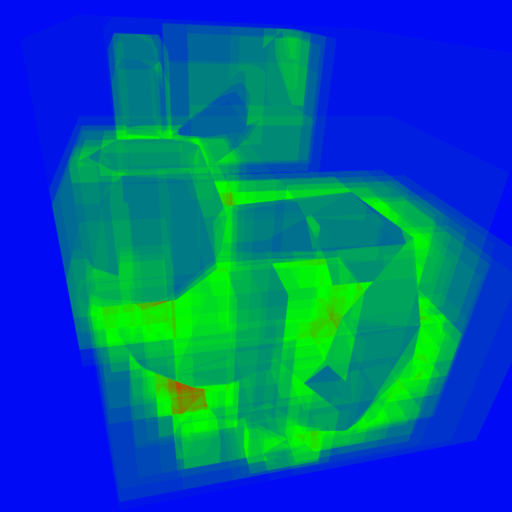 レイトレーシングではレイと三角形メッシュなどの交差判定を高速化するため、BVH (Bounding Volume Hierarchy)を初めとするAcceleration Structure (AS, 高速化機構)の構築を行います。ASを用いることでレイとシーン中の三角形との交差判定コストをBVHの場合はプリミティブ数Nに対してO(log(N))に抑えられます。一方で、ASの構築コストやメモリ使用量はBVHの場合はプリミティブ数におおよそ比例(O(N))します。