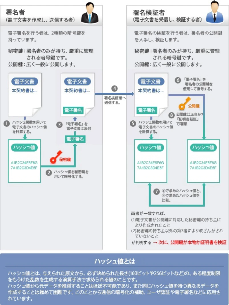 公開鍵暗号やハッシュ関数を使い、データに電子的に署名すること。ハッシュ関数によって改ざんを検知できるので、送信者が正しいことと伝送経路上でデータが改ざんされていないことを保証できる。