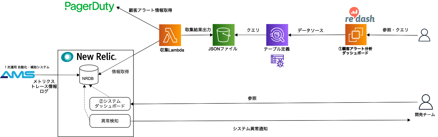 情報のソースとして顧客アラート情報はPagerDuty、システムに関する情報はNewRelic内のデータベース(NRDB)に集積しています。