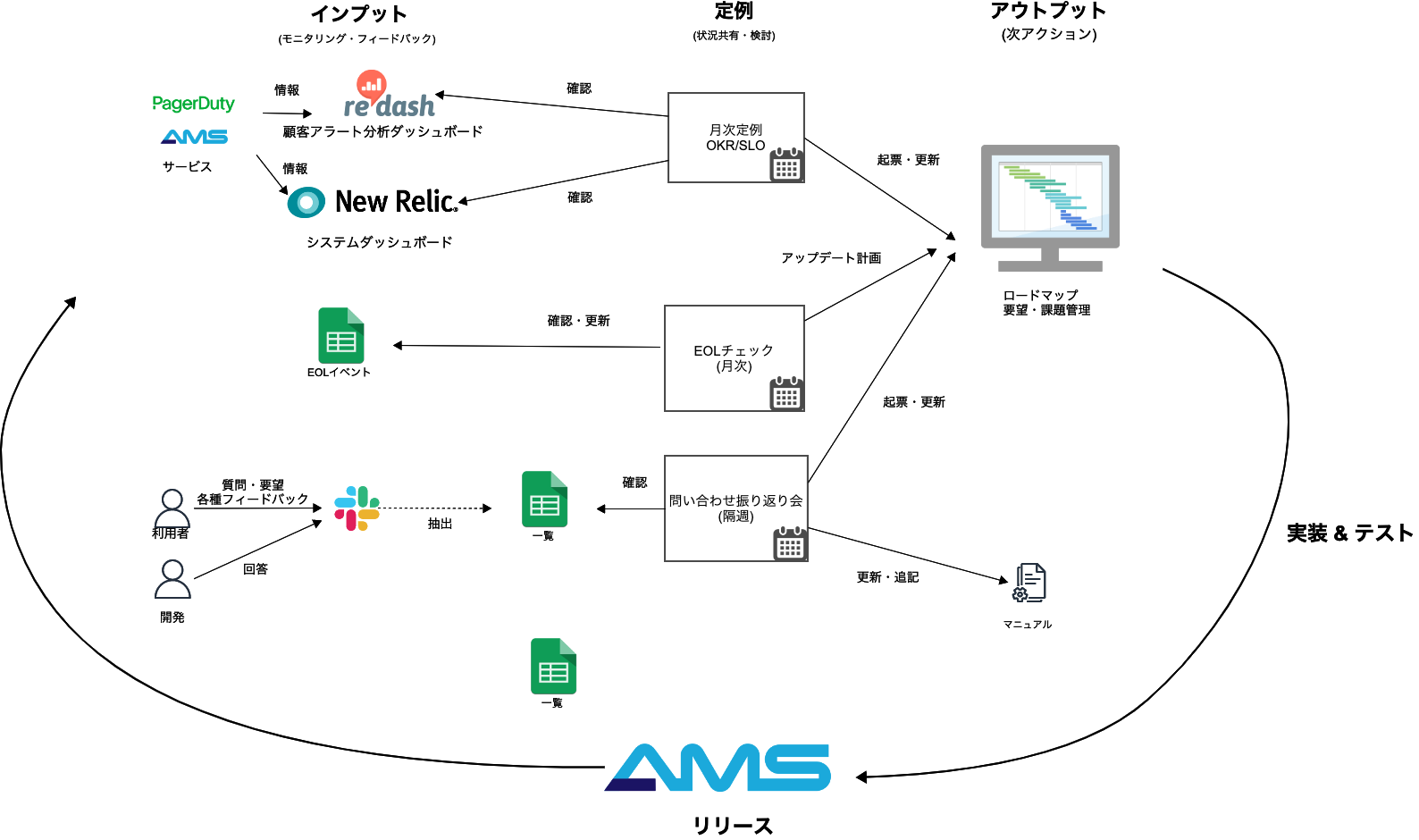 システムのモニター、効果測定、ユーザーからのフィードバックの取得や集積はツールやマネージドサービスを活用し、自動化できるところは自動化を進めています。それらの情報からアイディアや解決策を見出す部分は定例ミーティングを開きチームでディスカッションすることが多いです。