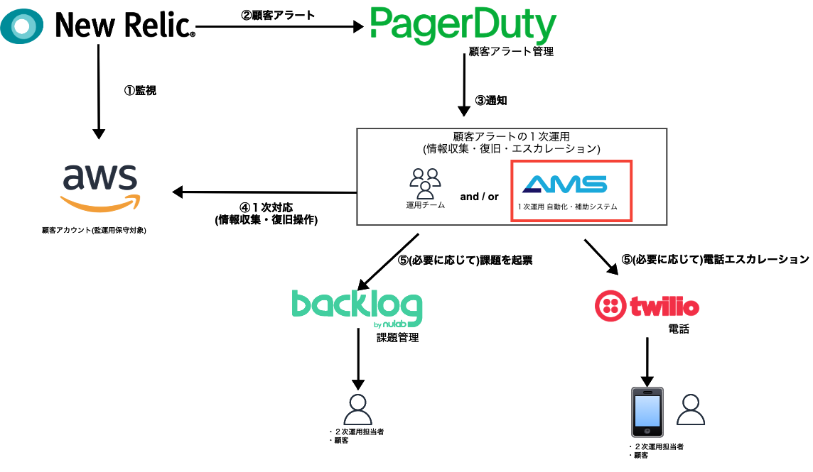 運用保守契約いただいている顧客のアカウントに、アラート(=顧客アラート)が発生したときに「情報収集」「復旧操作」「エスカレーション」を自動で行うシステムです。