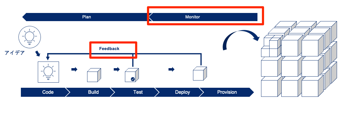 DevOpsでは、モニタリングできる仕組みを組み込み、開発サイクルを回しながらモニタリングした情報やユーザーのフィードバックをもとに次のアイデアを検討し、実装リリースしていくという流れがあります。