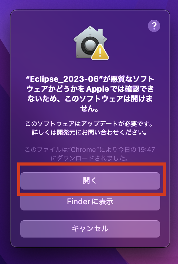 アプリケーションフォルダから「Eclipse_2023-06」をクリックするとセキュリティのエラーがでます