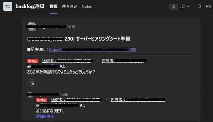 - 同一チケットNoの記事はTeamsスレッド表示
