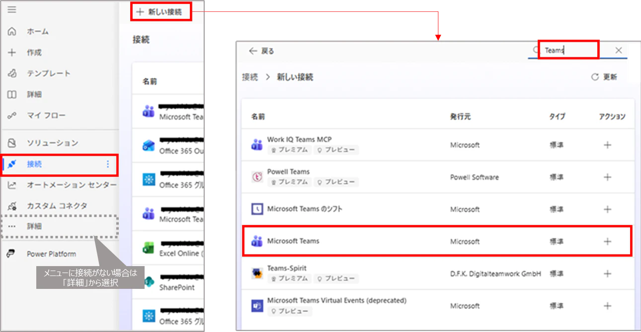 項目が大量にあるので右上の検索で接続対象を絞り込みます。(ここではTeams)