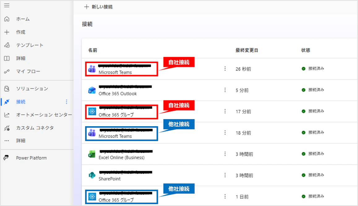 一覧表示だとどちらが自社・他社の接続か区別できないので、接続を選択して接続が利用されるフローで見極めてください。