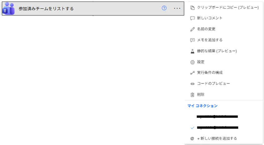他社接続するアクション(Teams/Office 365 グループなど)の三点メニューからマイコネクションを切り替えて他社接続します。
