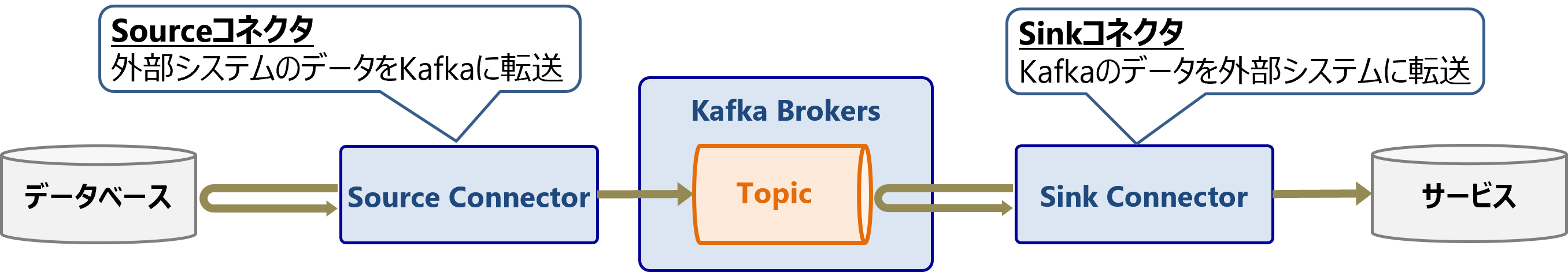 Kafka Connectにおけるデータ転送は「コネクタ」が実行します。コネクタには、外部システムのデータをTopicに転送するSourceコネクタと、Topicのデータを外部システムに転送するSinkコネクタの2種類が存在します。コネクタは常駐プロセスとして動作し、データを継続的に転送し続けます。