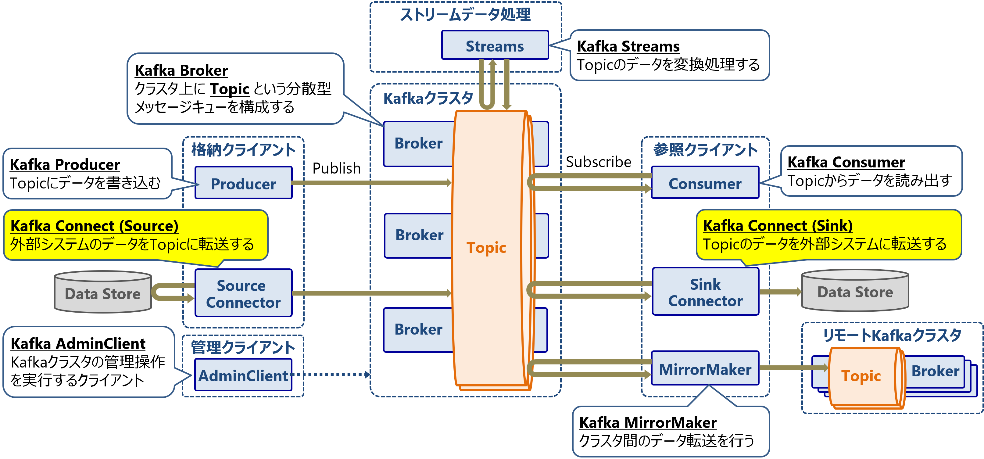 Apache Kafkaは以下のようなコンポーネントで構成されています。メッセージキューを構成するKafka Brokerを中心に、メッセージを格納・参照するクライアントとなるコンポーネント群があります。