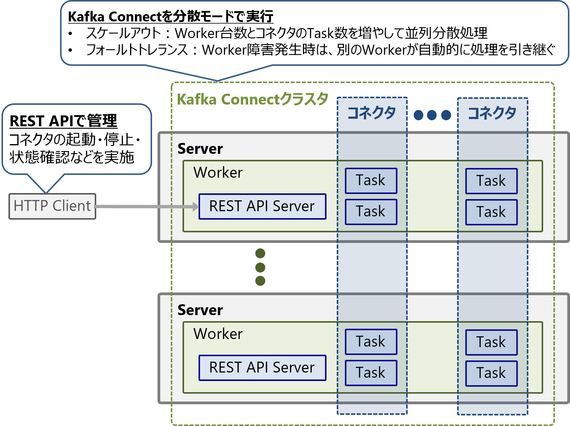 分散モードでは、複数台のサーバ上のWorkerインスタンスでグループ(クラスタ)を組み、その上でコネクタを実行・管理します。