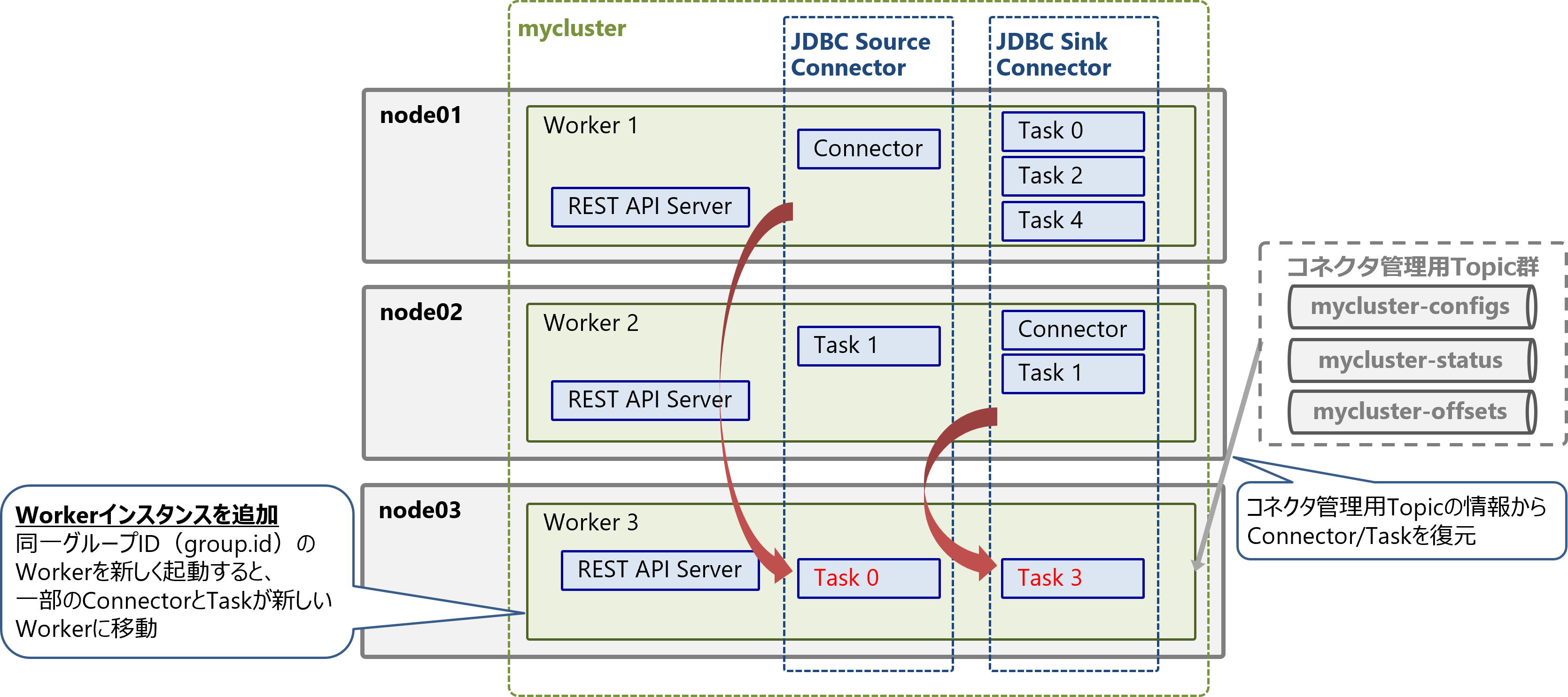 新しいサーバ上でWorkerインスタンスを起動すると、同一のgroup.idを持つWorkerは自動的にWorkerクラスタへ参加します。起動中のコネクタのConnectorとTaskの一部は、自動的に新しいWorkerに移動(リバランス)します。新しいWorker上のConnectorとTaskは、Connector管理用Topicの情報から設定、実行状態、Offsetが復元されます。
