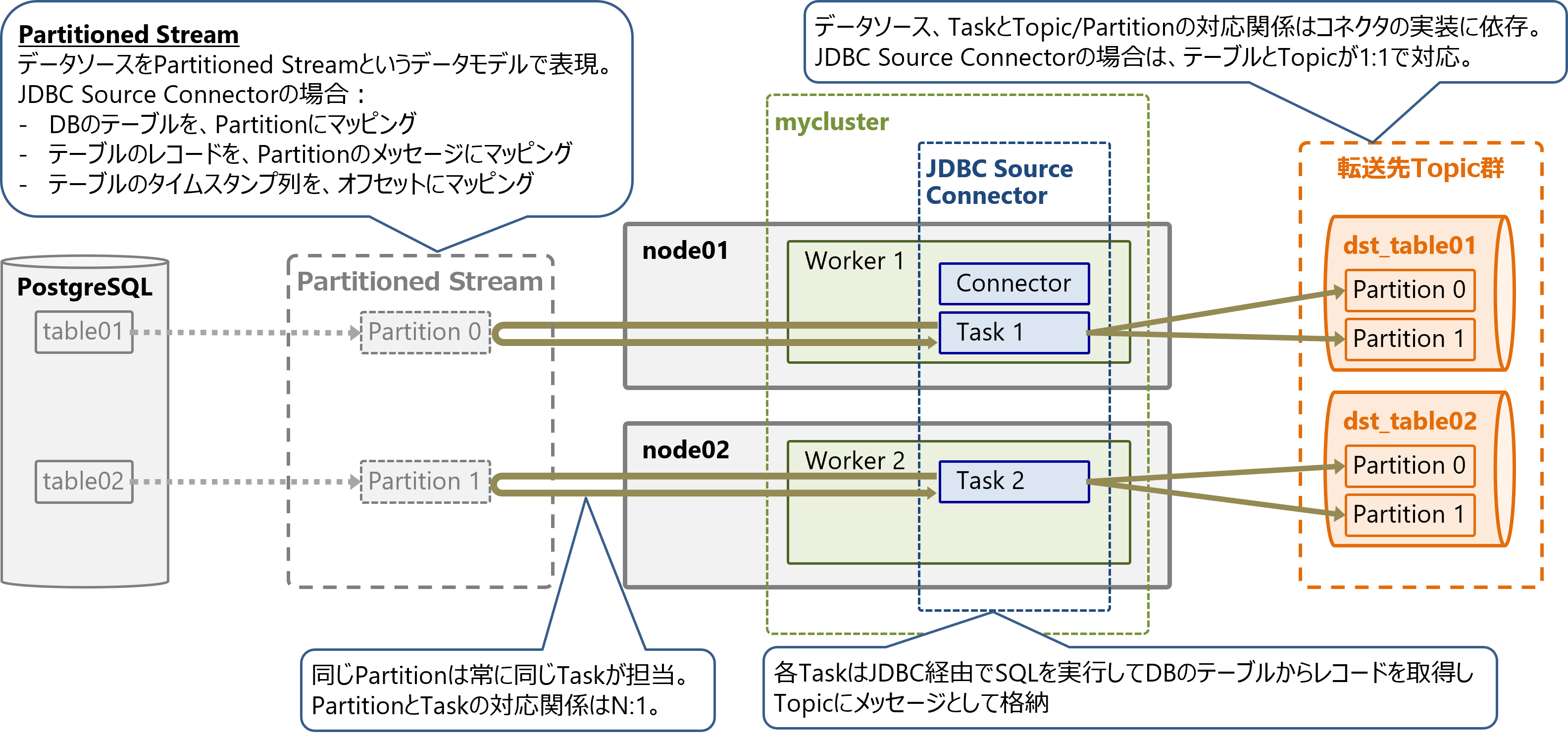 JDBC Source Connectorの場合、データベースのテーブルをPartitionにマッピングし、テーブルのレコード(各行)をPartitionのメッセージにマッピングし、テーブルのタイムスタンプ列をPartitionのOffsetにマッピングします。