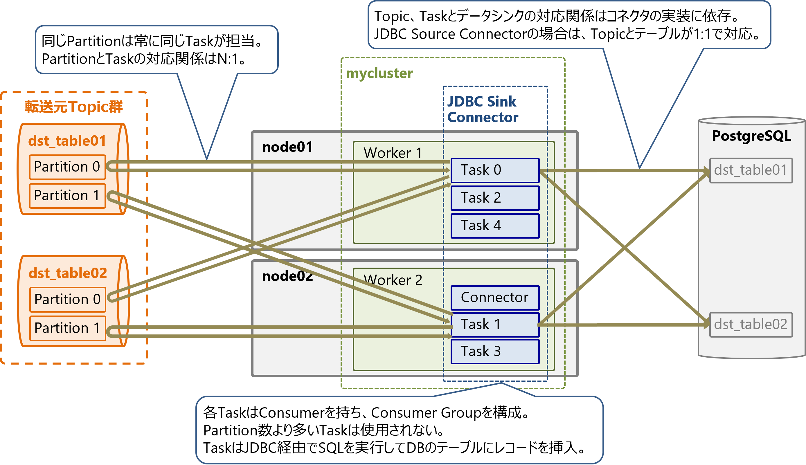 各TaskはPartitionからメッセージを読み出して、データシンクとなるデータベースにJDBC経由でSQLを実行し、テーブルにレコードを挿入します。Topic、Taskとデータシンクの対応関係はコネクタの実装に依存しますが、JDBC Source Connectorの場合は、Topicとテーブルが1:1で対応します。