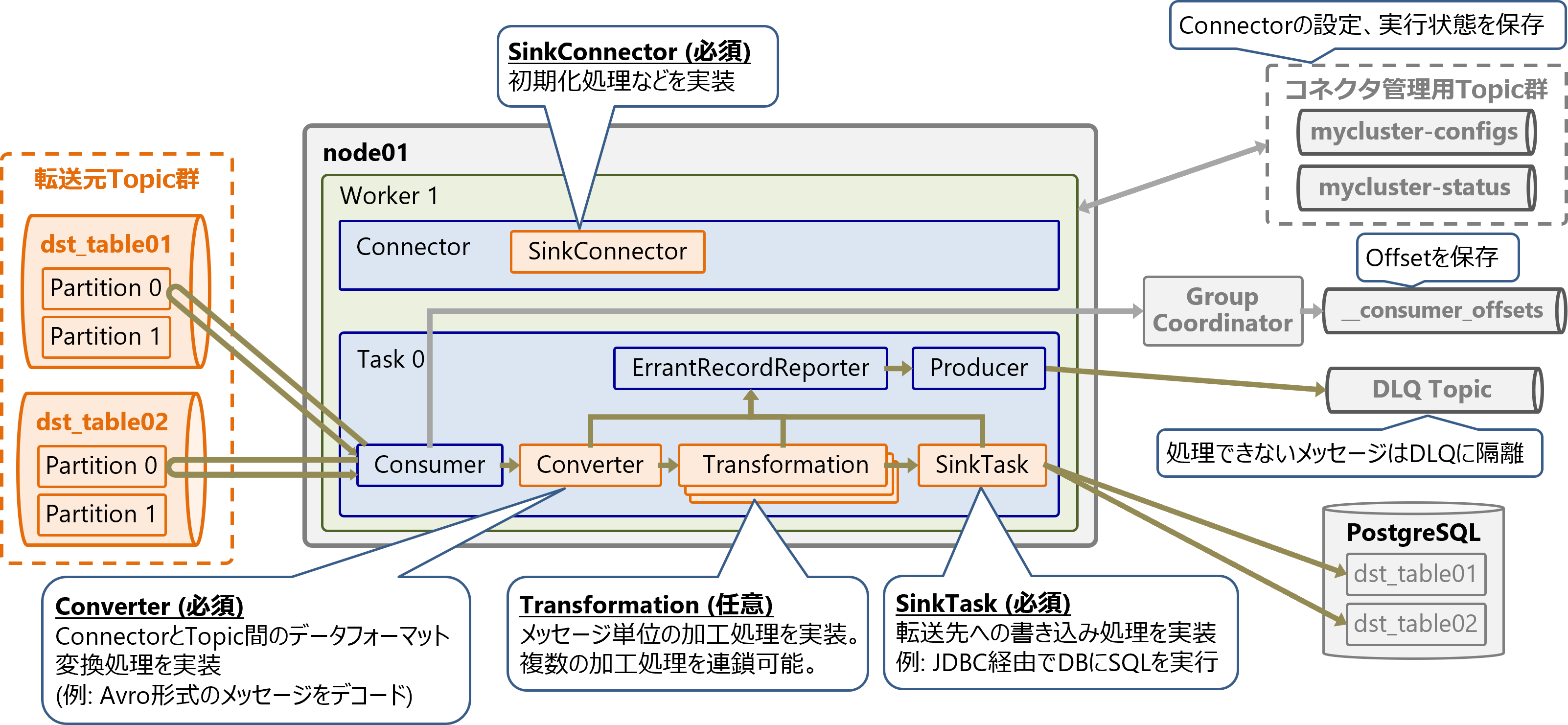 SinkコネクタのTaskはKafka Consumerと同様に、Topicからメッセージをどこまで読み出したかを示すOffsetを、Group Coordinator経由で専用のTopic__consumer_offsetsに保存します。