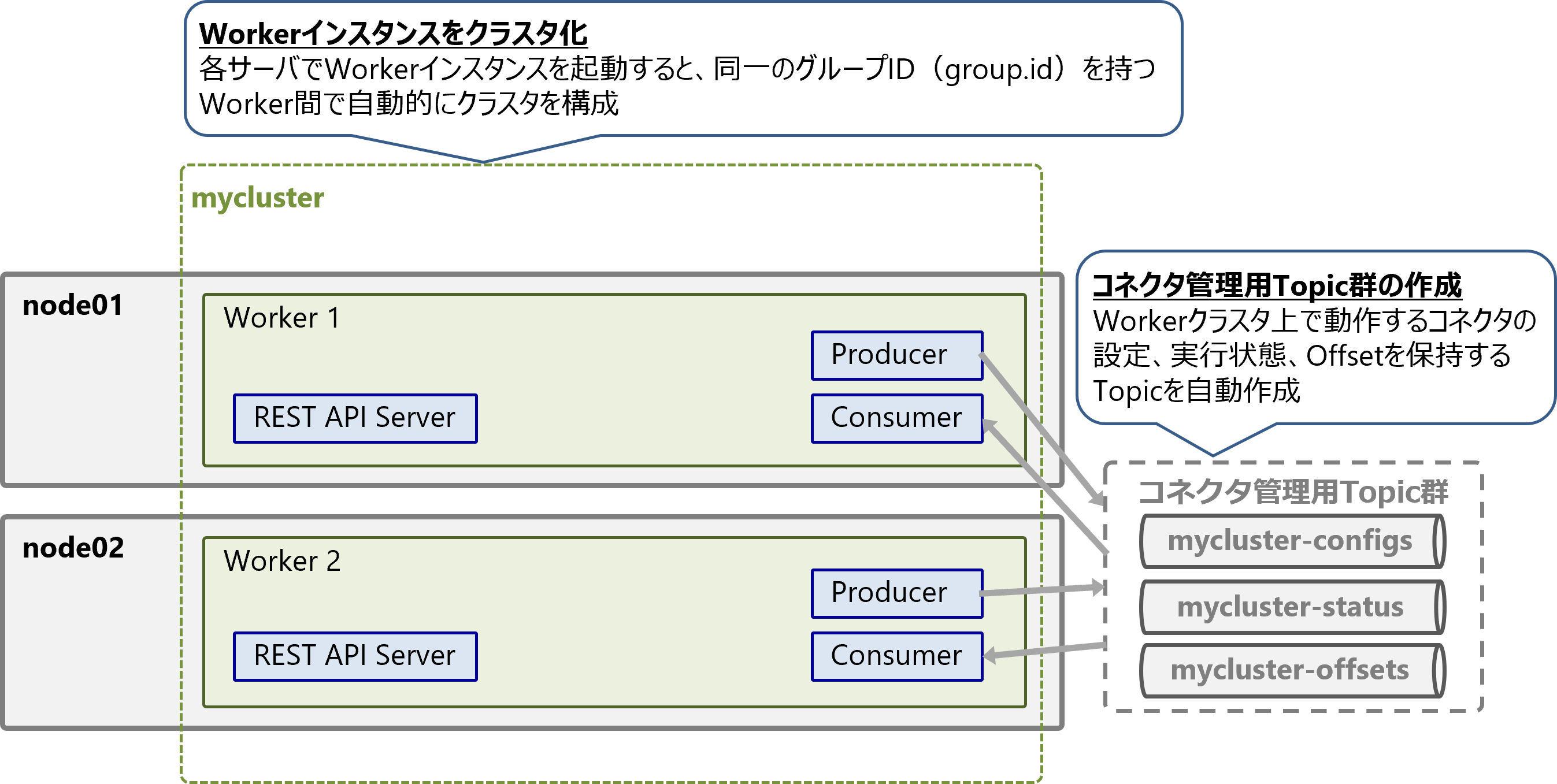 Workerを起動すると同じグループIDgroup.idを持つWorker間で、自動的にWorkerグループ(クラスタ)が構成されます。これはKafkaのConsumer Group機能を利用しており、Worker間はKafka Broker経由で通信して協調します。