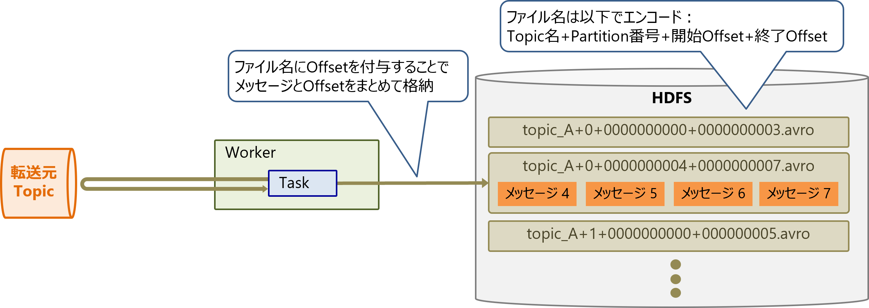 例えばHDFS 3 Sink Connectorでは、HDFSへ書き込むファイル名にOffsetを付与することで、同時に書き込みます。