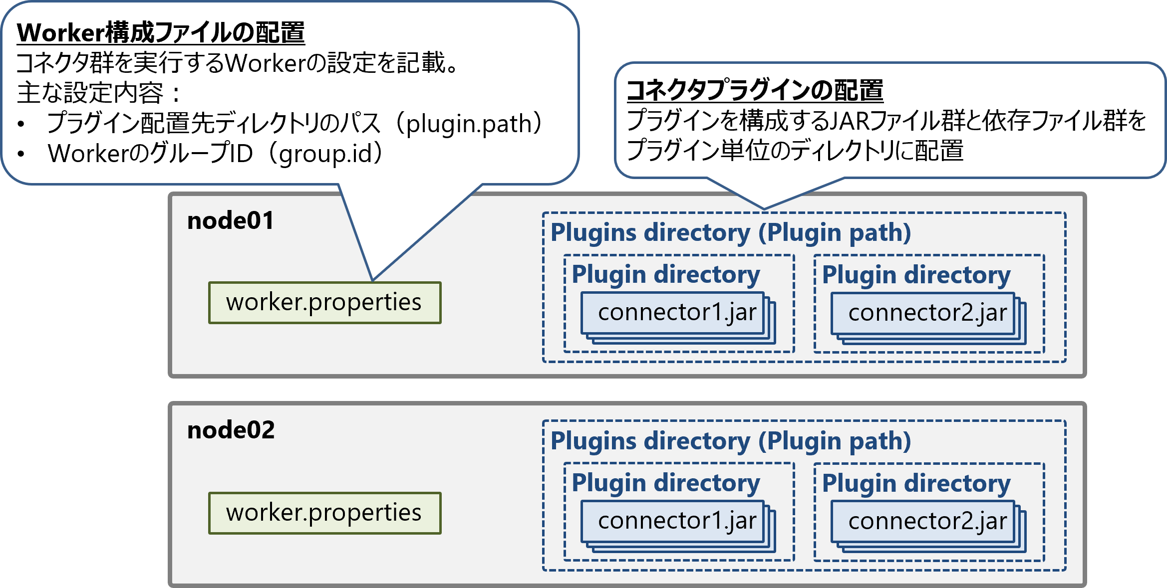 Kafka Connectクラスタを構成するサーバconnect01、connect02があるとします。事前準備として、各サーバに同一のWorker構成ファイルとコネクタプラグインを配置します。