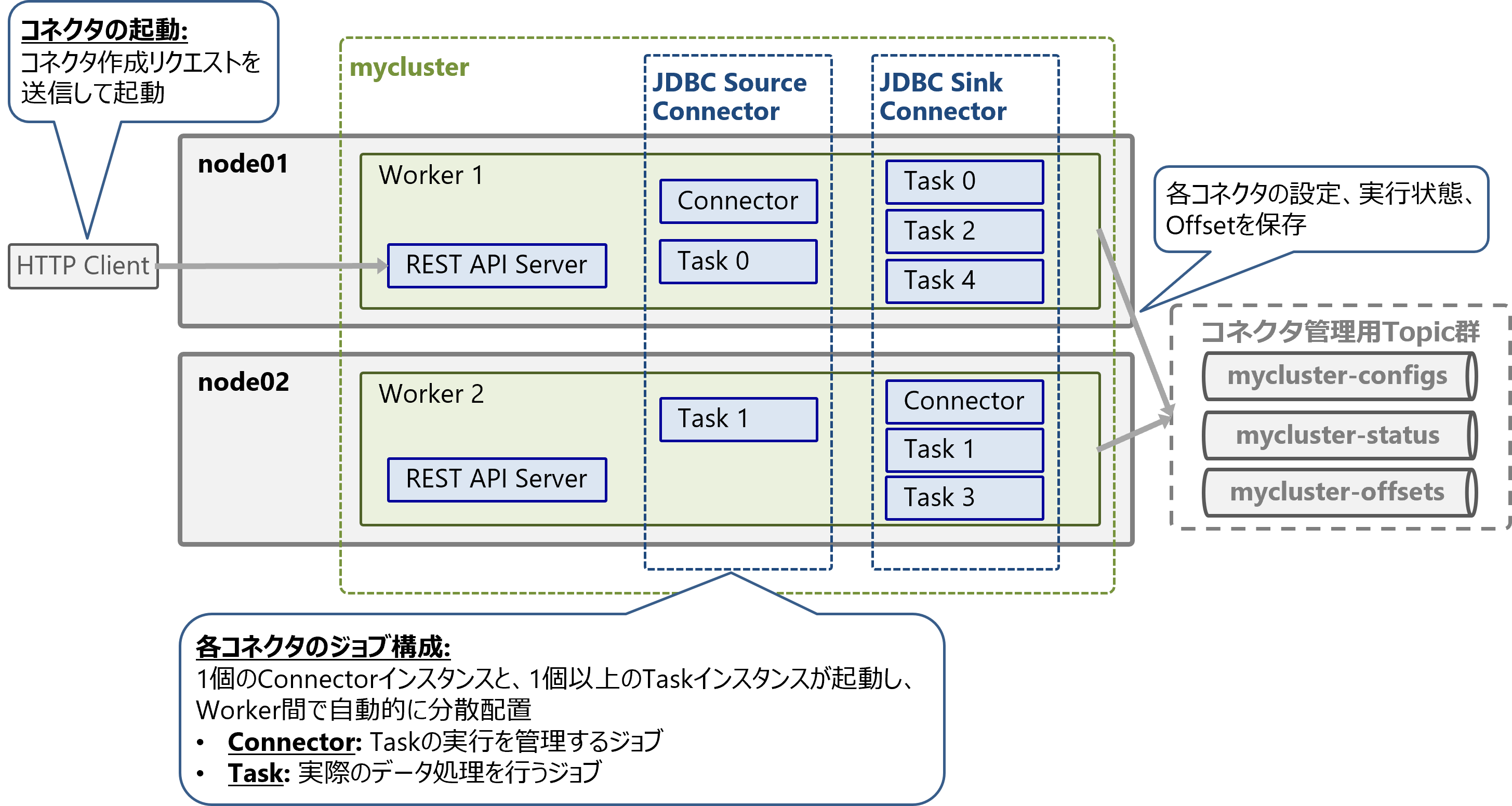 1個のコネクタを起動すると、1個のConnectorインスタンスと、1個以上のTaskインスタンスが起動し、Worker間で自動的に分散配置されます。ConnectorはTaskの実行を管理するジョブで、Taskは実際のデータ処理を行うジョブです。