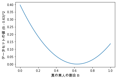 この変換はグラフにすると0.63を頂点とする下に凸な二次曲線であり、黒人の割合が0.63の時に最小値0をとりそこから黒人の割合が0方向に行っても、1方向に行っても増加するという形状です。例えば真の黒人の割合Bが0.83でも0.43でもデータセットの値は同じ0.04なのです(正確にはデータセットの値はこれを定数倍している)。