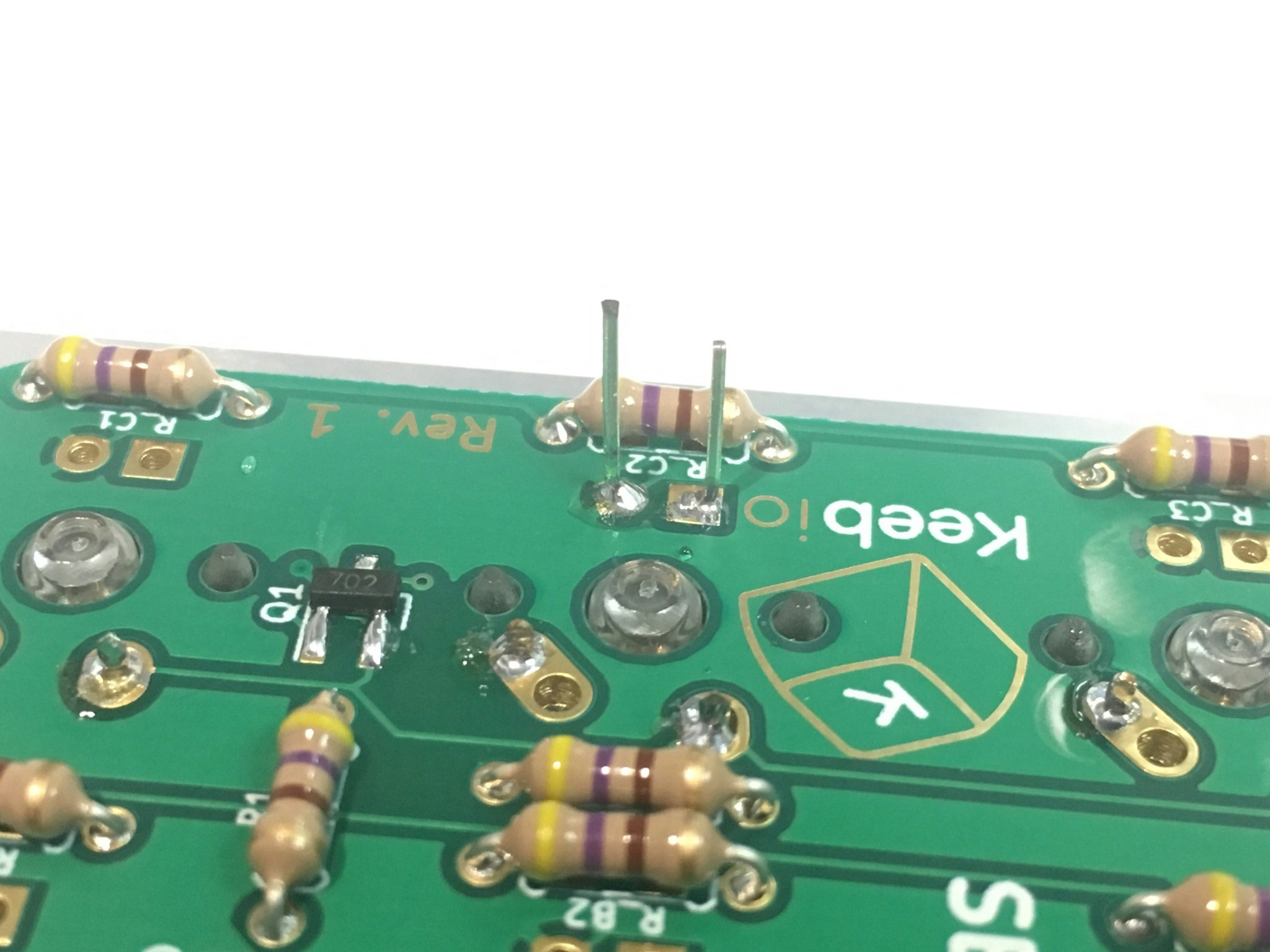 基板の裏側から抵抗を刺し、足を切った後に表側からはんだづけしていきます。
