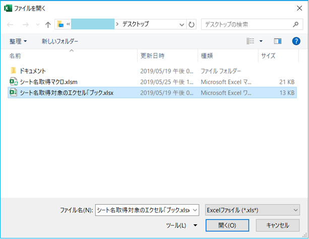 ファイルを開くダイアログが表示されるので、シート名を取得したい対象のエクセルブックをクリックして、「開く」をクリック。