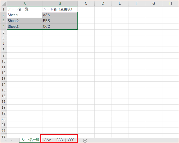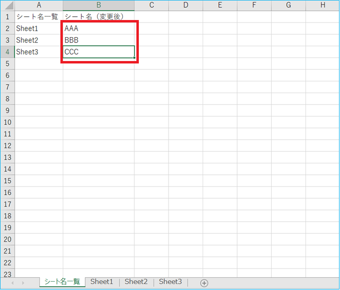 「シート名一覧」の「シート名(変更後)」に希望シート名を入力。