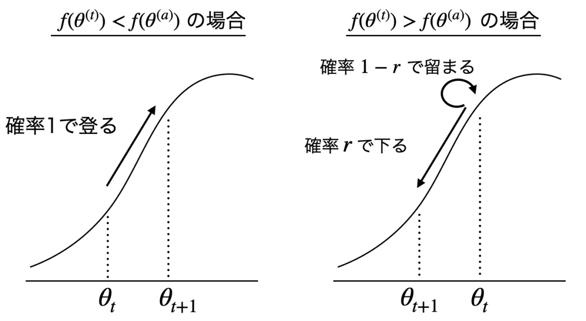 - 現在のパラメータを更新するか (θ(t+1) = θ(a)) 、もしくは更新しないか (θ(t+1) = θ(t)) を確率的に決定します。